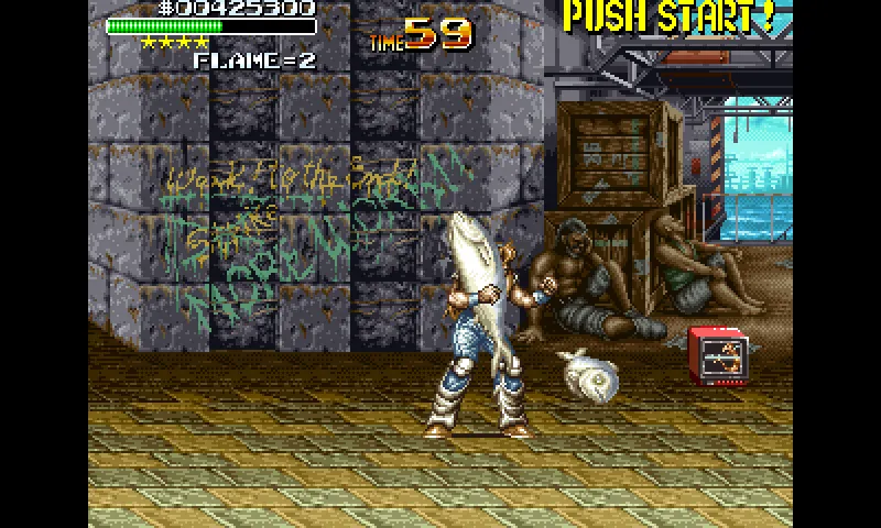 Помимо стальных кулаков и могучей пятки наши герои могут пользоваться всевозможными подручными средствами. Если выдернутые из песка сваи (анимация процесса выдергивания этой самой сваи – маленький шедевр «Копов»), кирпичи и факелы стали давно привычными для любителей beat'em up, то до использования в боевых целях… дохлого тунца (!) до японцев не догадался никто. Запустить тухлой рыбиной врагу в лицо — вот оно утонченное восточное коварство