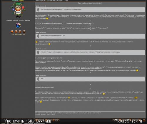 1 - Андрей ( Семёнов Андрей Сергеевич ) 2 - Мои абсолютно ( ну ладно, на 99% ) законные, правильные ( в специально предназначенном для них месте ) и не запрещённые вопросы, удалили ( без объяснений ). 3 - Если какой-то из множества заданных вопросов, был недопустимым, то я считаю, что нужно было бы мне сказать и предупредить, а на остальные ответить ( многие из них, абсолютно нормальные, и заданы мной для лучшего понимания мной правил ). Ещё, есть такой пункт: 6.1 Пользователям запрещается обсуждать действия модераторов, или администратора где-либо, кроме форума «обсуждение и предложения по администрации сайта». 6.2 Если такая тема создана в другом форуме, она должна быть перенесена модератором в форум «обсуждение и предложения по администрации сайта». из которого следует, что какие либо обсуждения руководства, должны быть перенесены в соответствующую тему, а не просто удалены как будто их и не было. 4 - если надо, то могу выложить скриншоты моих вопросов ( как-то теперь без скриншотов некуда ), но поскольку факт удаления невозможно заскриншотить, то даже не знаю 5 - жалоба на неизвестно кого 0о ( в связи с чем, будет и вторая ) ибо никто не прокомментировал это действие.