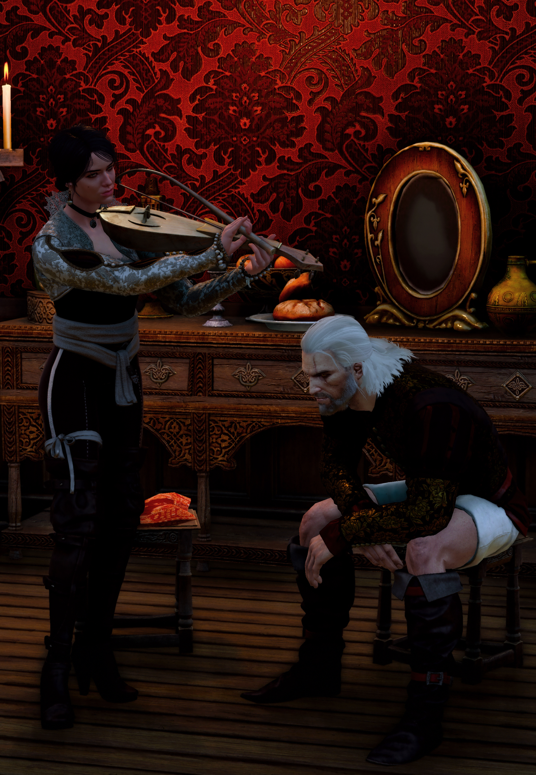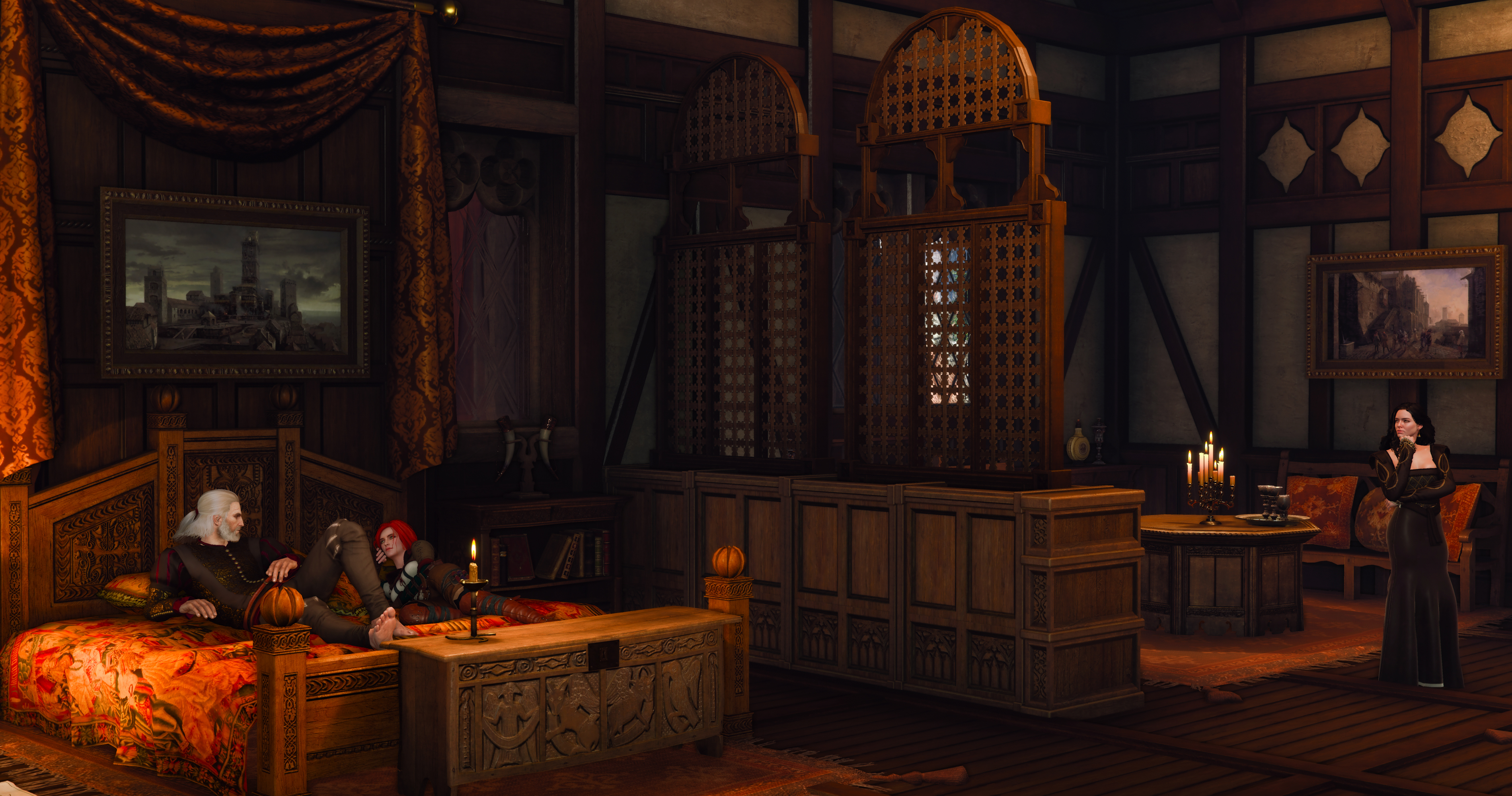 -нет, ну ладно Геральт хоть обувь снял, но ты Трисс забралась на моё любимое покрывалко в грязных сапогах, ах ты лахудра крашена, да я тебе все кудряшки то поотрываю и сделаю мочалку Геральту -да чё я то, я вообще просто прилег, заснул, сморило меня после вчерашнего, просыпаюсь, рядом Трисс лежит, а чего лежит еще не спрашивал, Трисс ты чего тут лежишь? -иди бабушке своей сказки рассказывай звиздун -нету у меня бабушки, сирота я