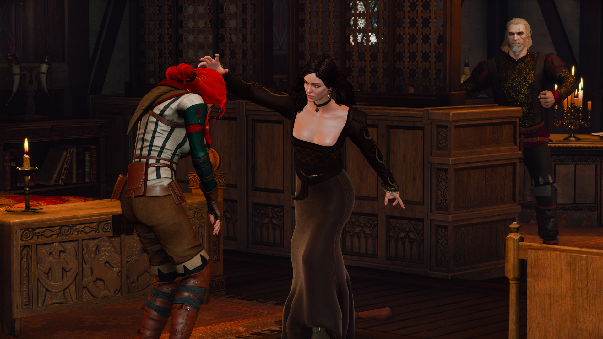- С дороги, Геральт! Щас я сама у неё спрошу, чего она тут лежит! - Не приближайся ко мне! Сумасшедшая! - Фсё, достала! Патлы повыдёргиваю, лахудра рыжая! - Ай! Щука! Волосы не трогай! - Ты мне ещё и за маяк ответишь! - Воо! Бабы бьются! - А ну залезь обратно!