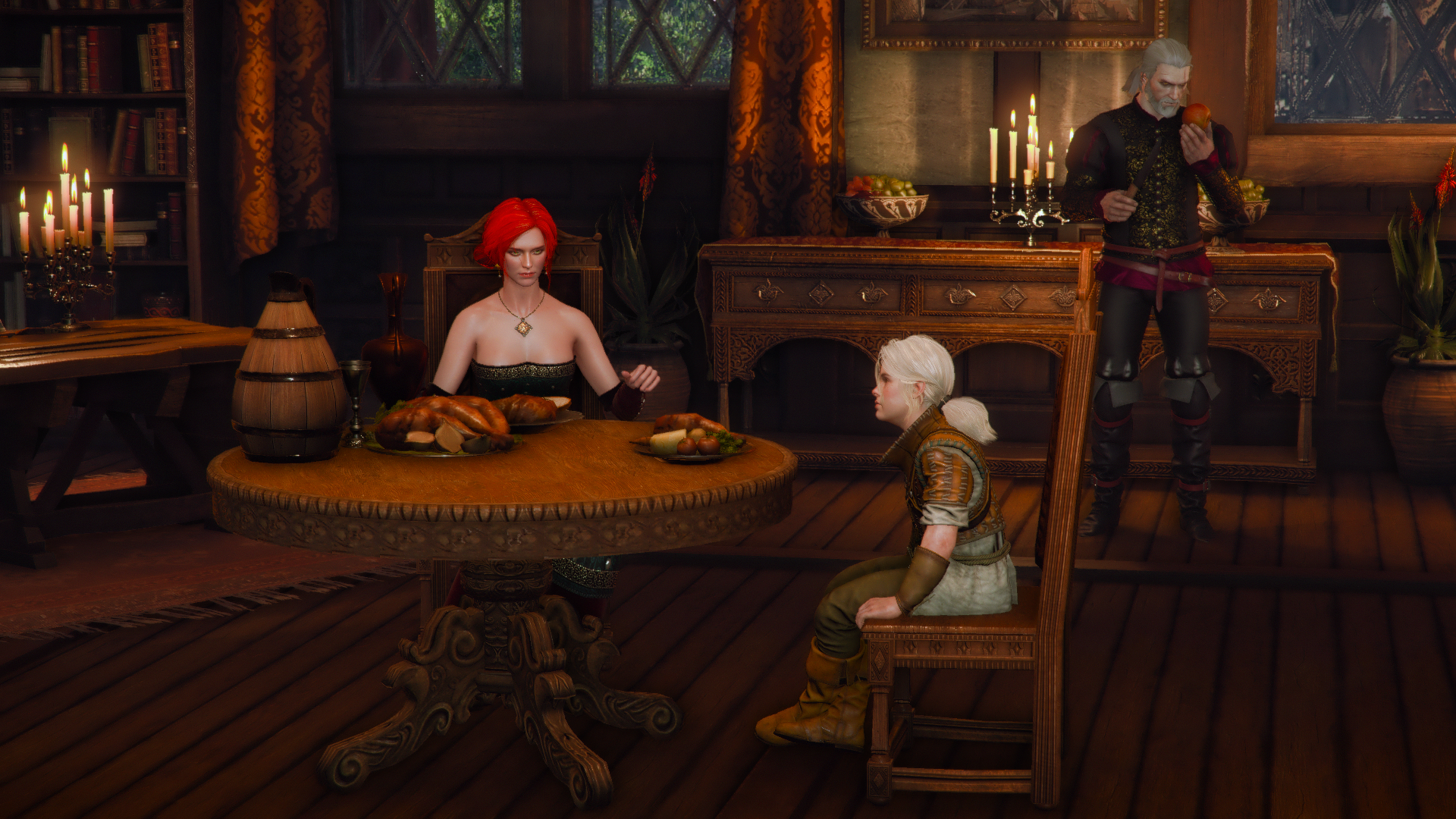 - Ура! Папка Геральт с работы вернулся! - Цири, спроси у него что на ужин готовить... Он принёс что-то из продуктов? - Папа Геральт? - Скажи ей, что "Ван дер Хууй" вполне обойдётся яблоками и виноградом. Тебе я принёс белый шоколад и эклеры. - А маме Трисс? - А маме Трисс я на ужин наловил лягушек на Кривоухих топях. На большее вдохновения не хватило после вчерашней нарезанной морковки