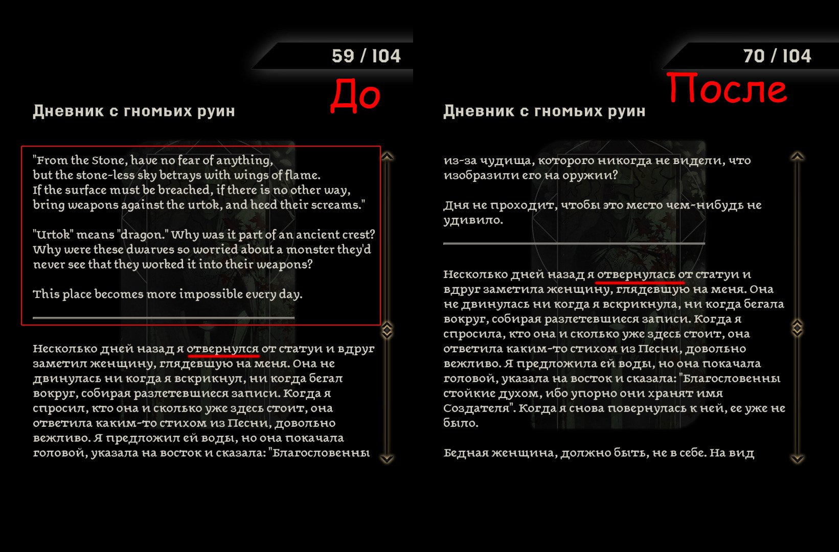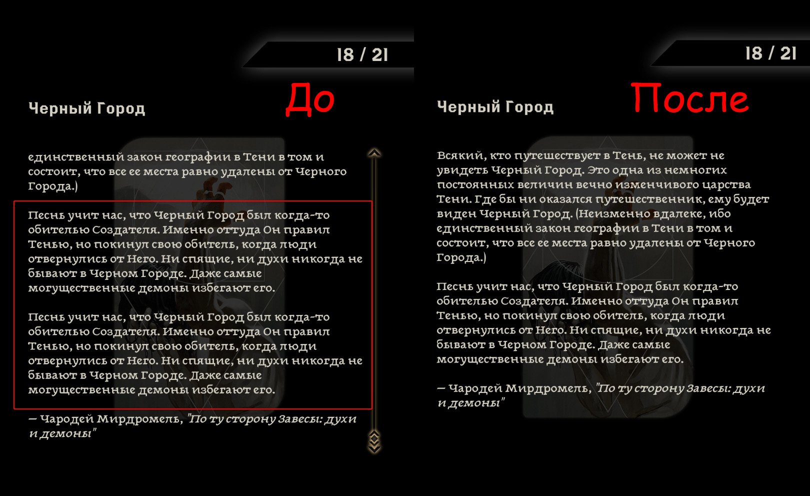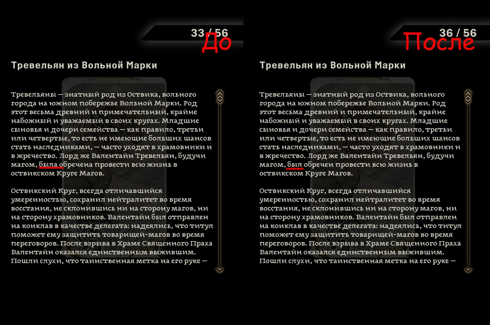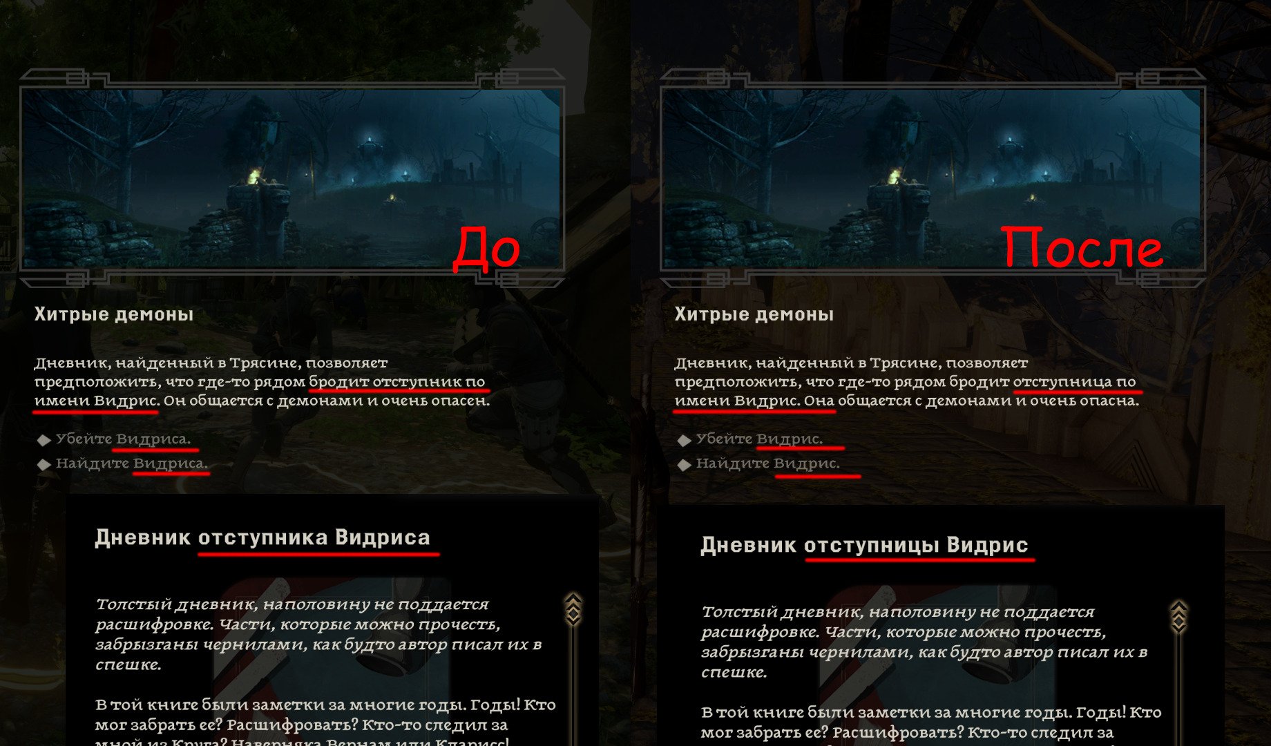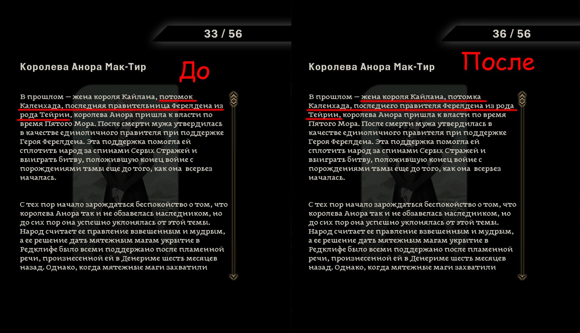 Я так и не нашла мода, что правил бы ошибки русской локализации DAI, поэтому я делаю его сама) В данный момент исправления касаются только текста (невычищенный английский текст, путаница с полом в пределах одной записи, дублирование текста, незакрытые тэги и т.д.), а не неправильных плот-флагов (хотя не исключаю, что когда-либо освою и это). Конечно, такую работу не сделать за один раз, я лишь в начале этого пути, так что мод будет обновляться, буду благодарна, если кто будет кидать мне скриншоты с ошибками перевода, это ускорит процесс)
