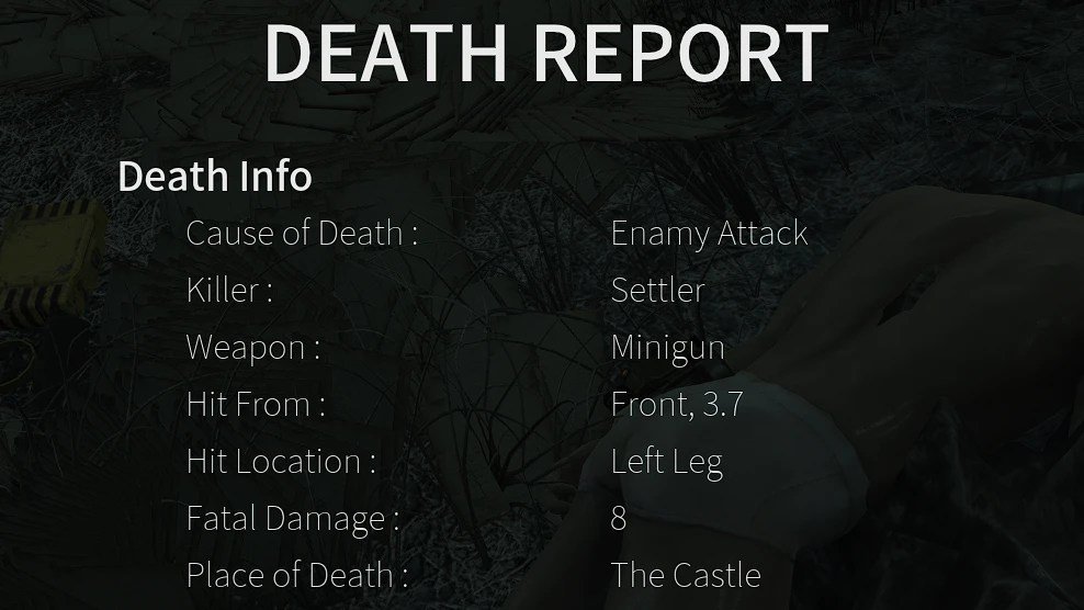 Добавляет пользовательский интерфейс отчета о смерти, который появляется всякий раз, когда игрок умирает или теряет сознание, показывая подробную информацию о причине. После смерти игрока отображается отчёт, содержащий разделы «Личная информация», «Информация о смерти» и «Статистика боя». В разделе «Информация о смерти» отображаются такие данные, как имя убийцы, использованное оружие, место удара и нанесённый урон. Если вы используете мод (вроде