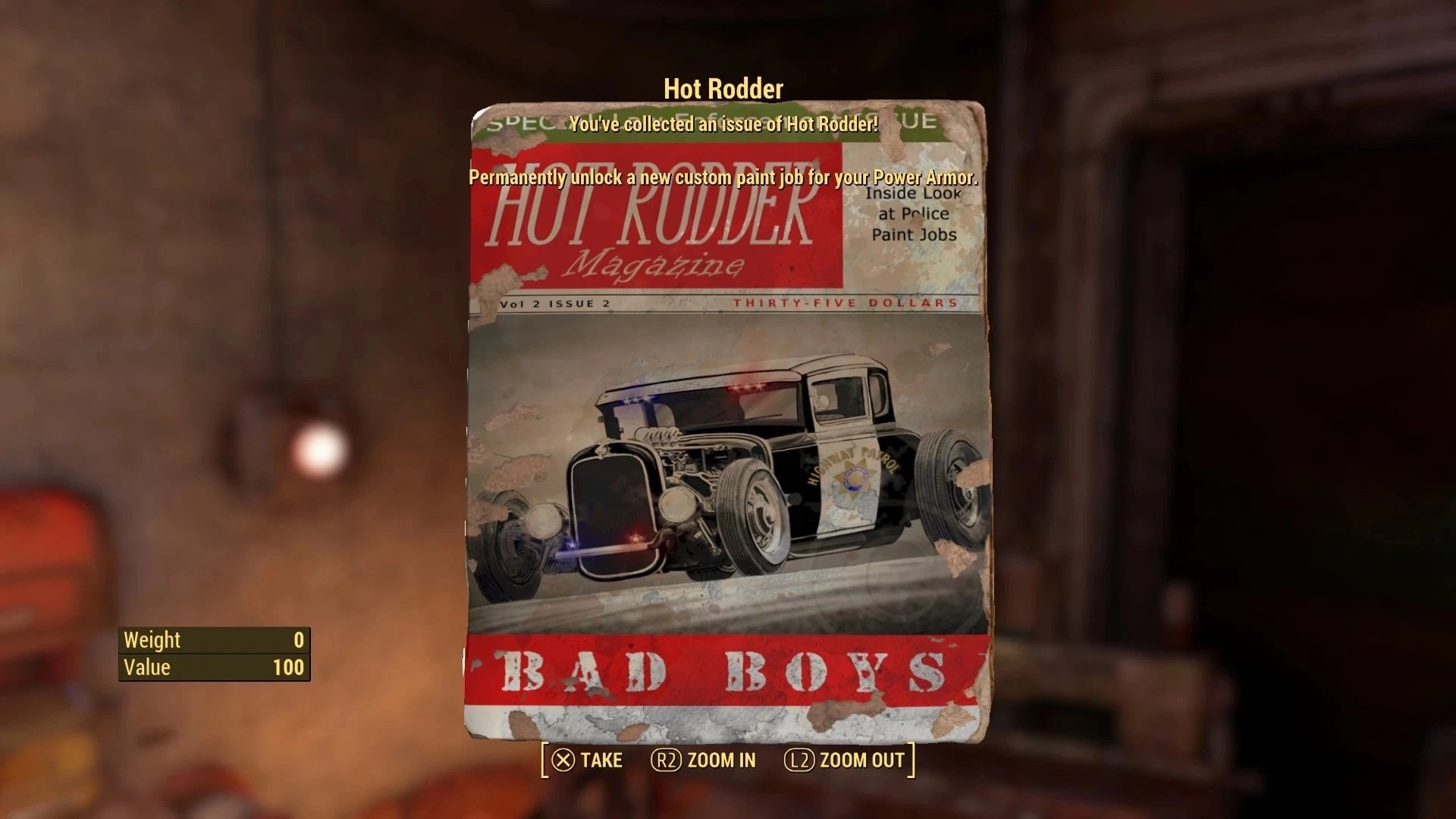 ЛОРный метод: По всему Содружеству разбросаны 4 журнала перков, которые дают вам возможность изготовить части торса в химлабораториях в разделе "Силовая броня госслужащих" и вредную окраску на станции обслуживания брони. Журналы расположены в логических местах, за исключением журнала пожарного департамента, поскольку Бетесда забыла ссылку на карту мира, хотя бы один пожарный департамент.