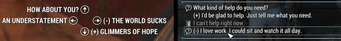 Показывает, как выбор диалогов влияет на симпатию вашего спутника. Мод добавляет символы «+» или «–» перед вариантами ответа в диалоге, которые могут повлиять на расположение вашего текущего спутника.