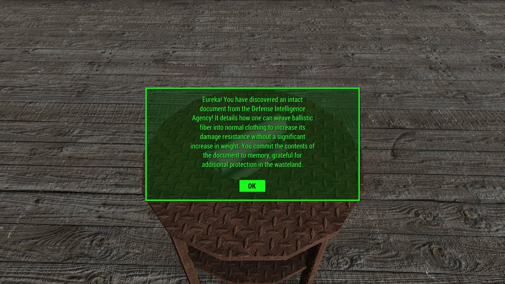 Получите возможность создавать баллистическую ткань, не вступая ни в одну фракцию. Вам просто нужно найти где-нибудь в Содружестве неповрежденные документы Агентства военной разведки...Мод добавляет 15 «Неизвестных документов» в различные локации Содружества. 12 «Белых» документов и 2+1 «Синих» документа.Прочтение «белого» документа даст Выжившему 5%-ный шанс получить способность создавать баллистическую ткань, тогда как прочтение «синего» документа даст 100%-ный шанс.