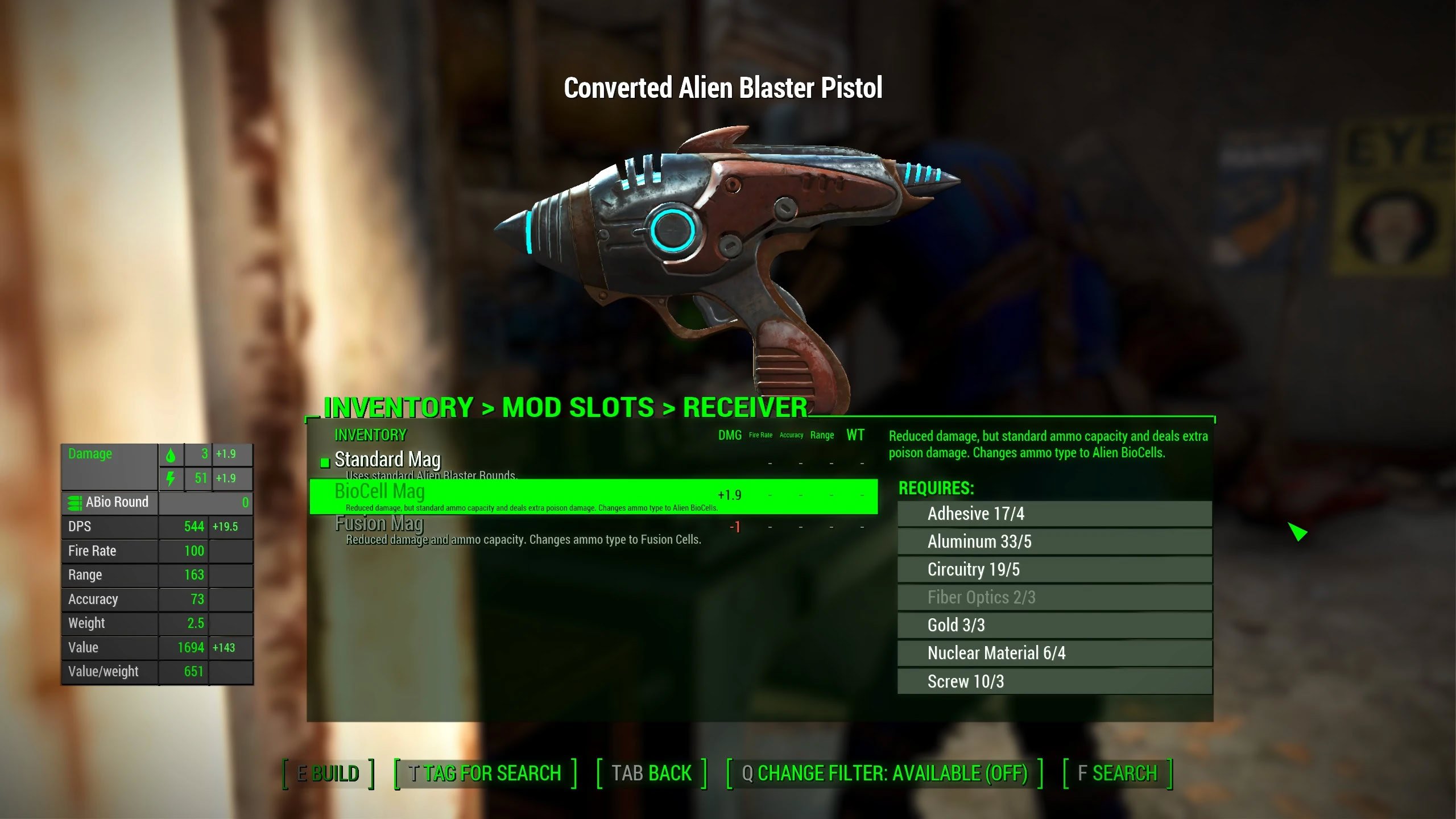 Обладая навыками «Оружейник», «Сумасшедший стрелок"» и Наука, вы можете разблокировать рецепт инопланетных бластерных ячеек. Однако на низких уровнях навыка этот рецепт неэффективен. На более высоких уровнях открываются более эффективные рецепты. Вы всегда можете вернуться к изучению двигателя позже, чтобы подробнее изучить его и улучшить свой рецепт.Установка и удаление стандартные.