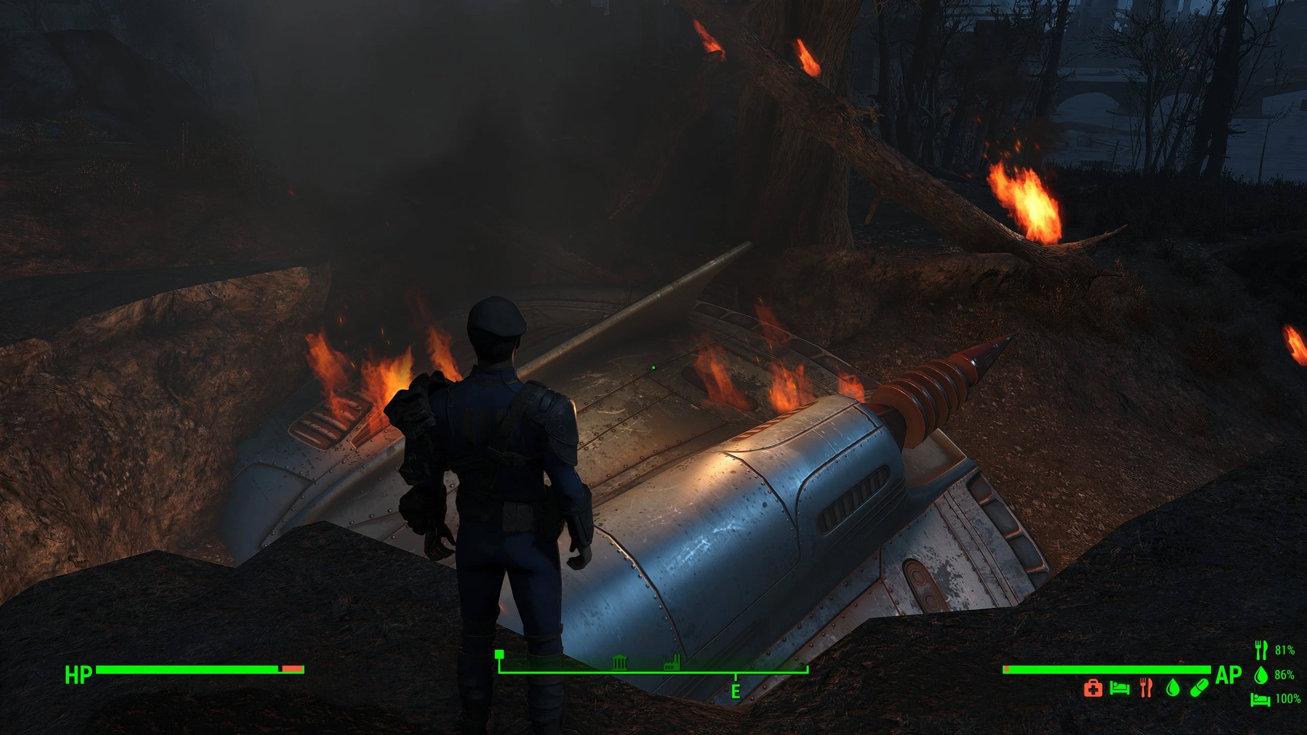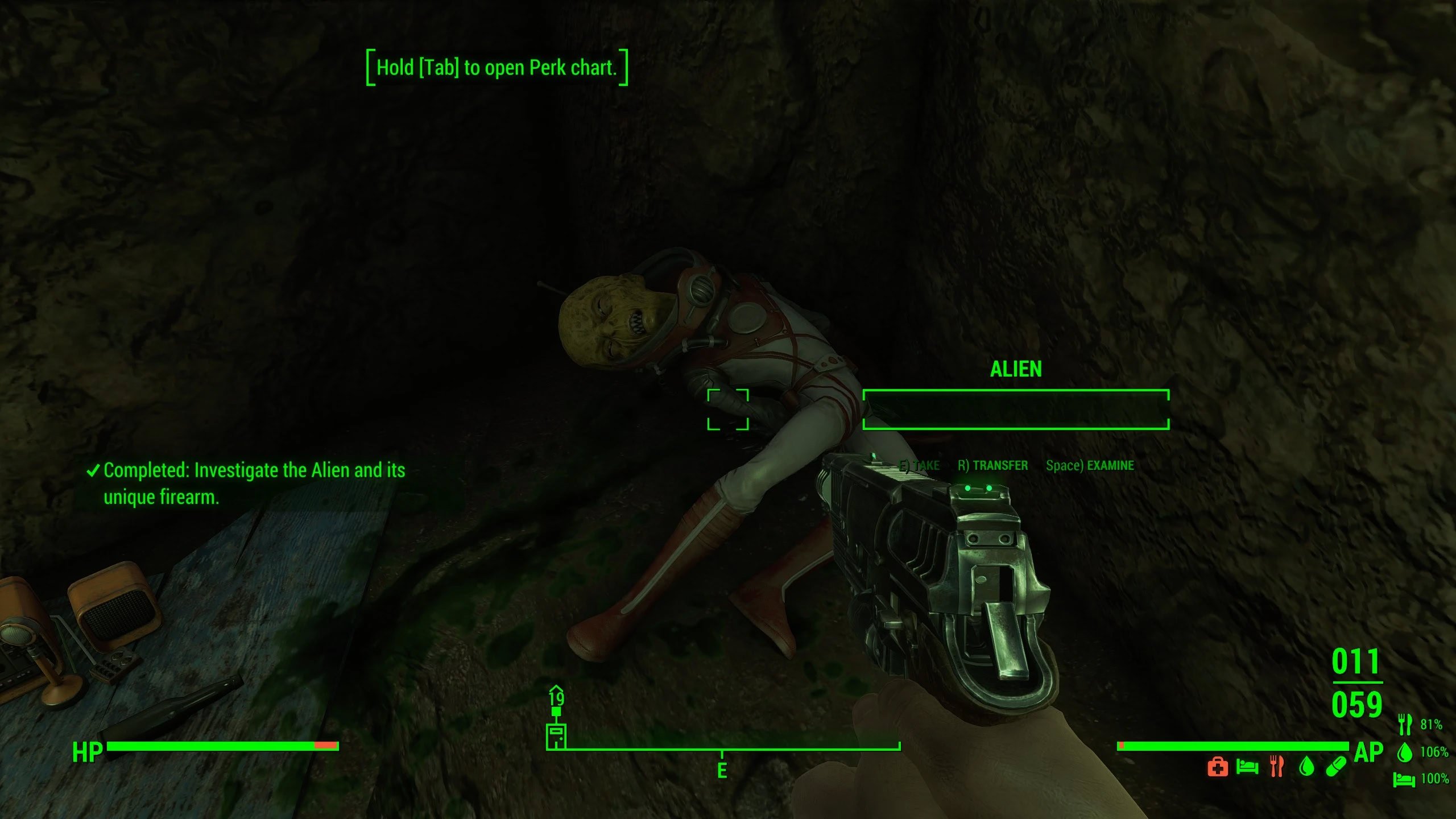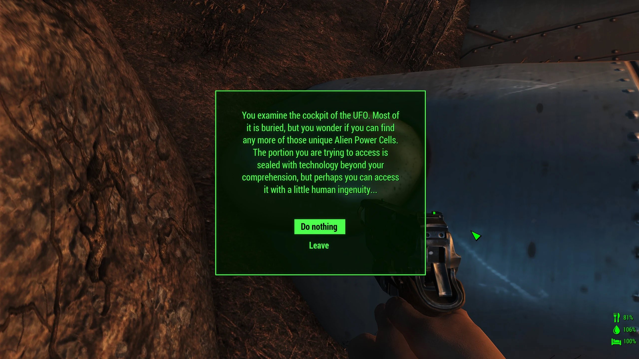 Варианты перков для разблокировки кабины: «Эксперт-подрывник" + Взрывчатка, «Силовая броня», «Взломщик" 4-го ранга, «Дуракам везет», «Хрясь!» 2-го ранга. Для каждого перка разные текстовые сообщения. Разблокировка кабины дает 150 дополнительных ячеек для инопланетного бластера.Осмотрите двигатель НЛО.