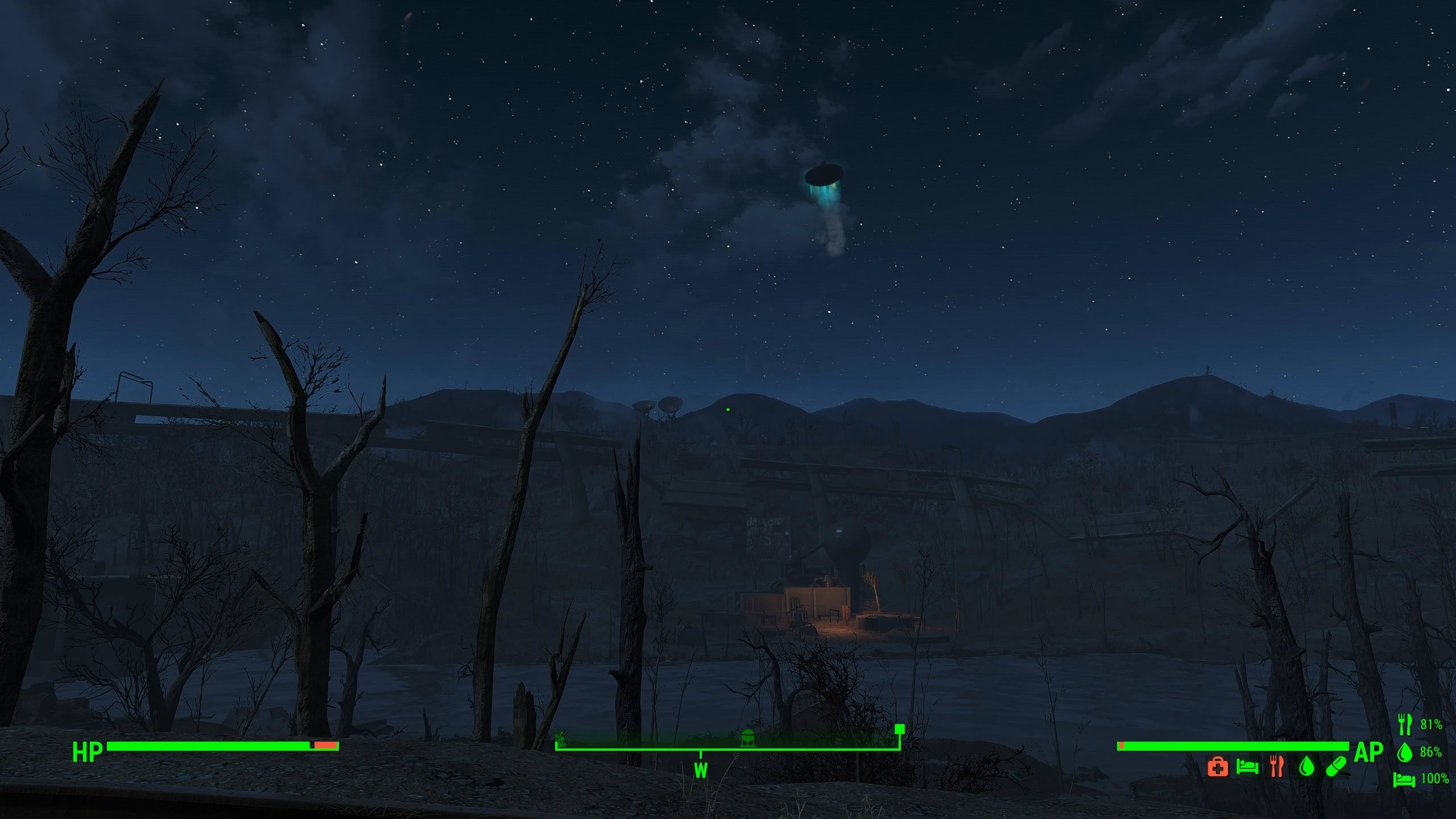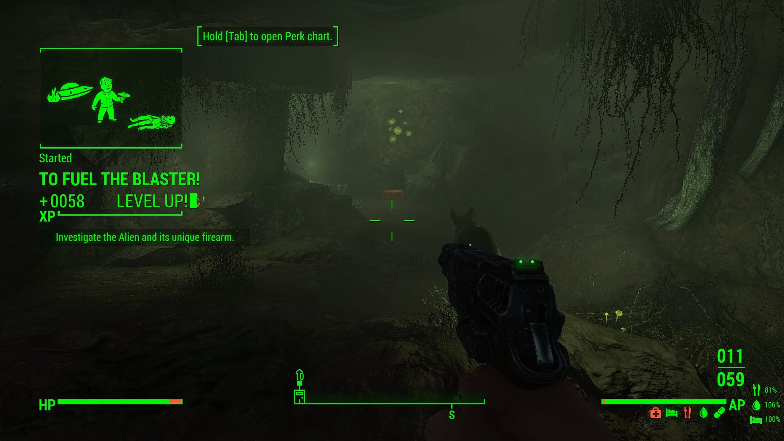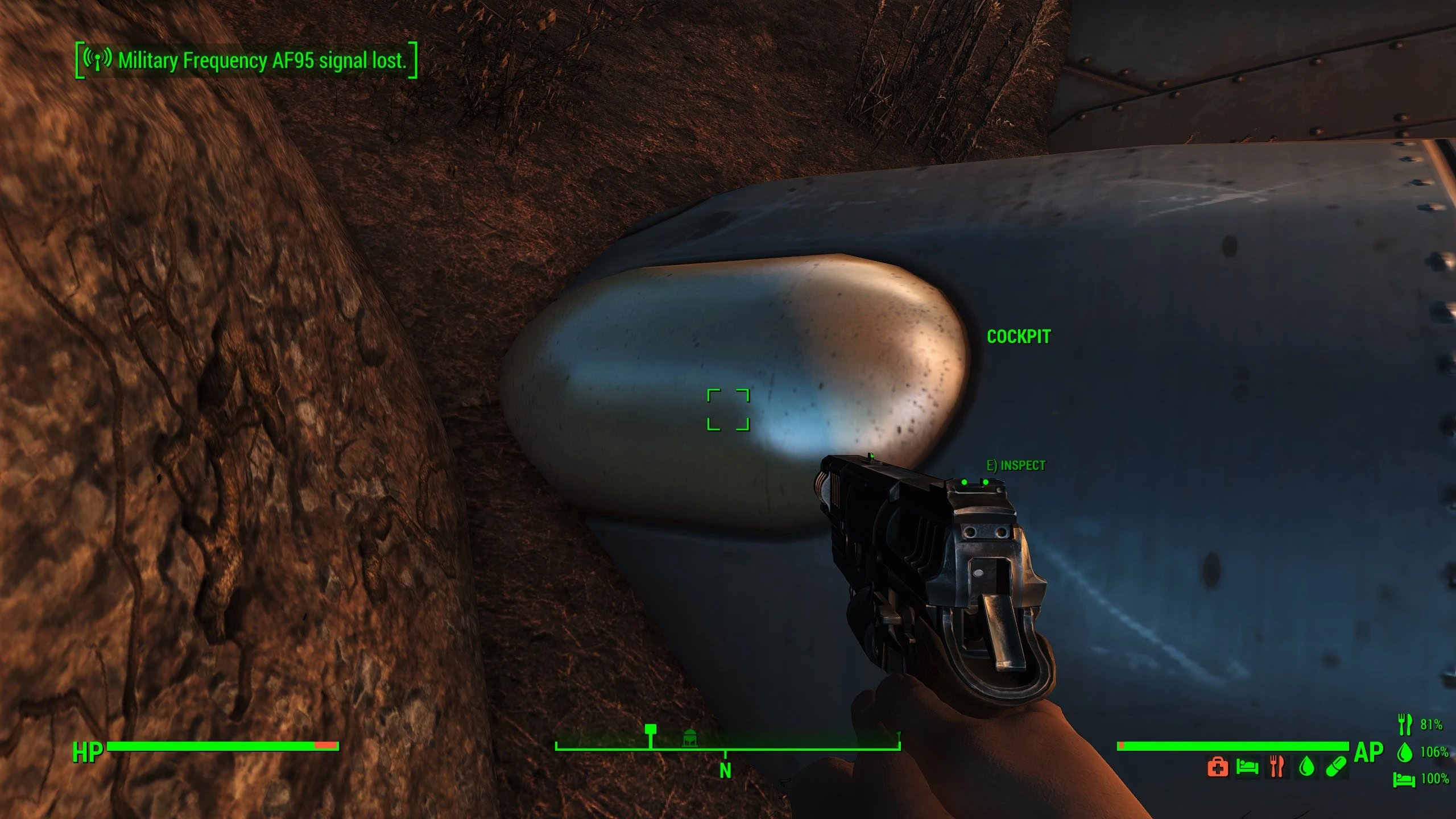 Варианты перков для разблокировки кабины: «Эксперт-подрывник" + Взрывчатка, «Силовая броня», «Взломщик" 4-го ранга, «Дуракам везет», «Хрясь!» 2-го ранга. Для каждого перка разные текстовые сообщения. Разблокировка кабины дает 150 дополнительных ячеек для инопланетного бластера.Осмотрите двигатель НЛО.