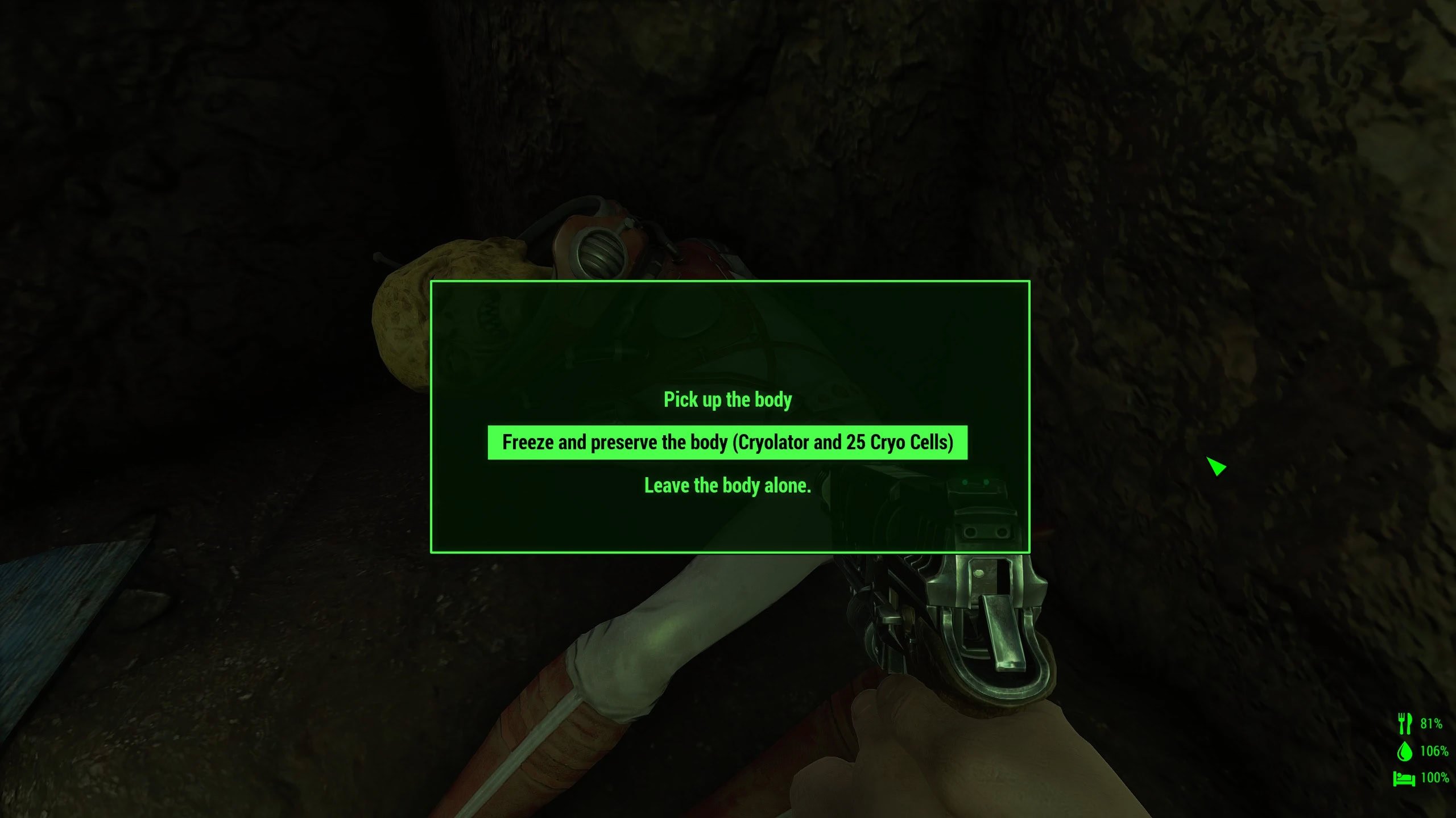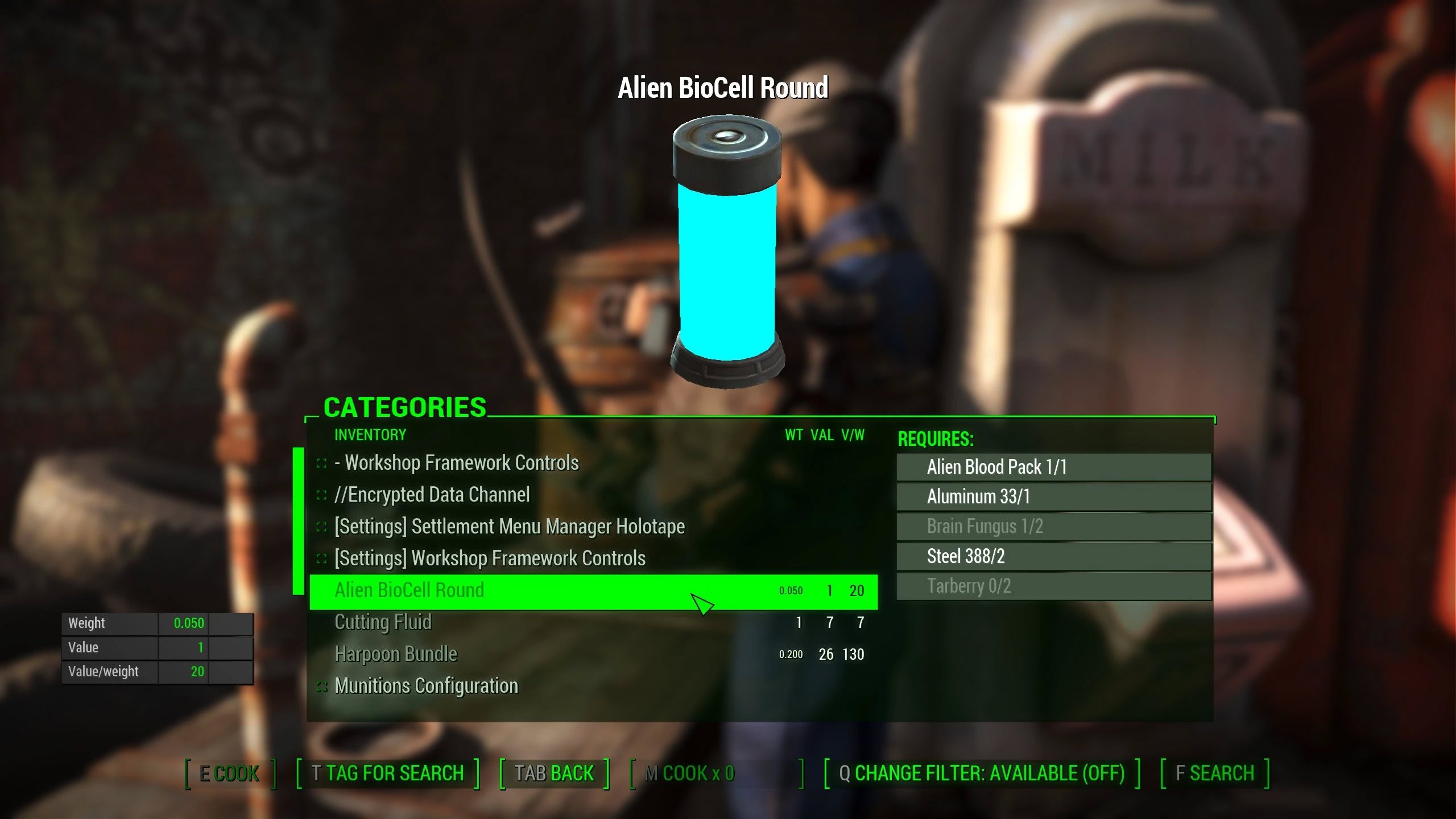 Короткий квестовый мод, предоставляющий возможности в стиле RPG для создания боеприпасов к инопланетному бластеру.Хорошо сочетается с модами, которые изменяют инопланетный бластер или добавляют инопланетное оружие, использующее стандартные боеприпасы (которых в ванильной игре очень мало).Мод является ESL и не займет слот в порядке загрузки. Кроме того, все записи новые, поэтому ничего не должно конфликтовать.Квест запустится либо после убийства Чужого, либо, если вы уже убили его и его труп исчез, когда вы встанете на/рядом с разбившимся НЛО.У вас есть три варианта с множеством способов доступа к этим вариантам (достаточно ли вам вариантов?), чтобы получить заветные боеприпасы.Сначала вы можете исследовать труп, чтобы раскрыть его потенциал. Вам понадобятся навыки "Каннибал", Науки и Медицины, "Химика" (с навыками работы с химикатами) или "Дуракам везет". После того, как вы узнаете, для чего предназначен труп, вы можете отнести его в поселение. В зависимости от ваших действий (замораживание, сжигание или просто переноска тела) вы получите труп лучшего качества и более эффективный рецепт для изготовления инопланетных биоячеек. Инопланетные биоячейки наносят также урон ядом и не уменьшают емкость магазина бластера.Осмотрите кабину НЛО.