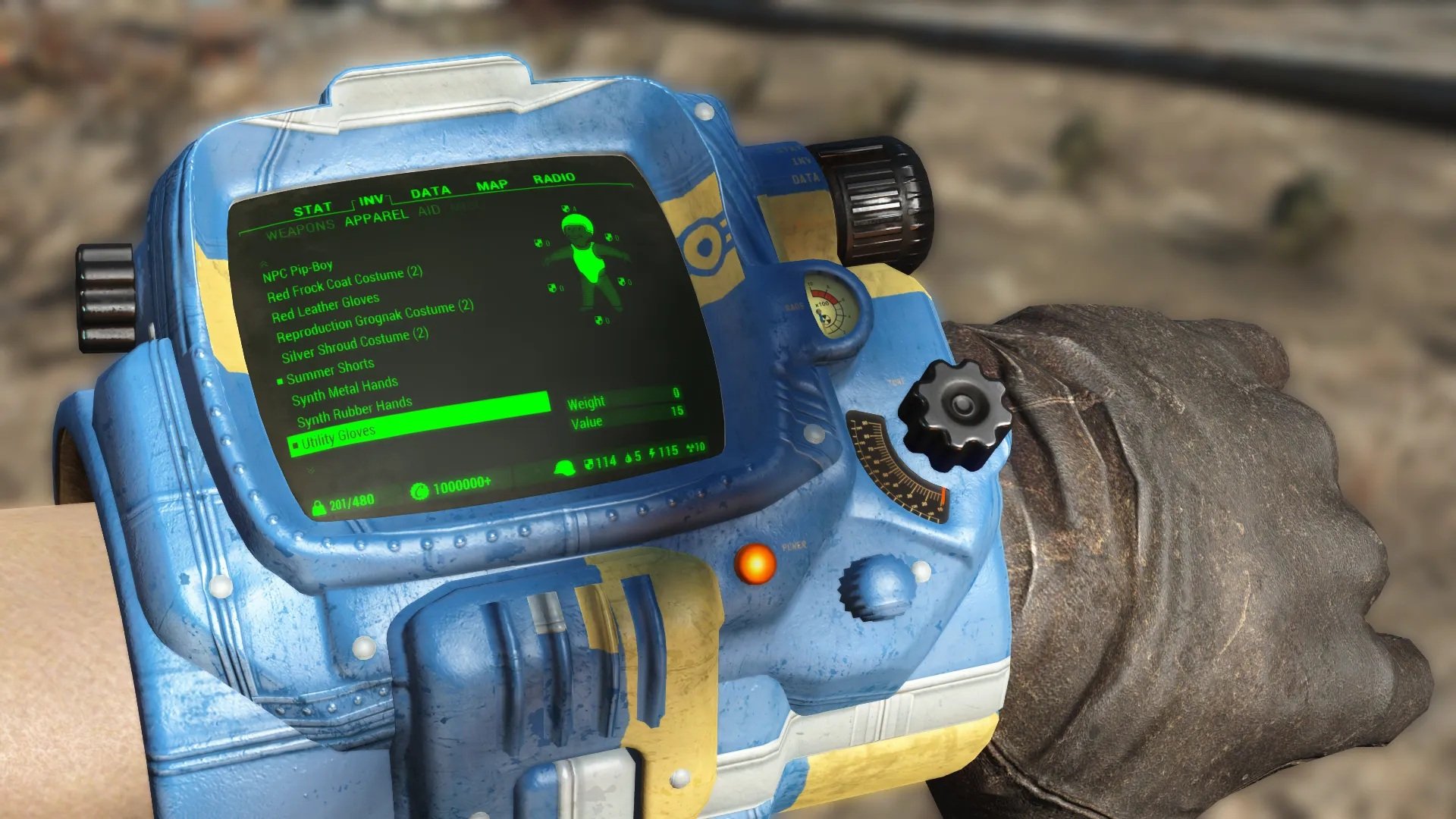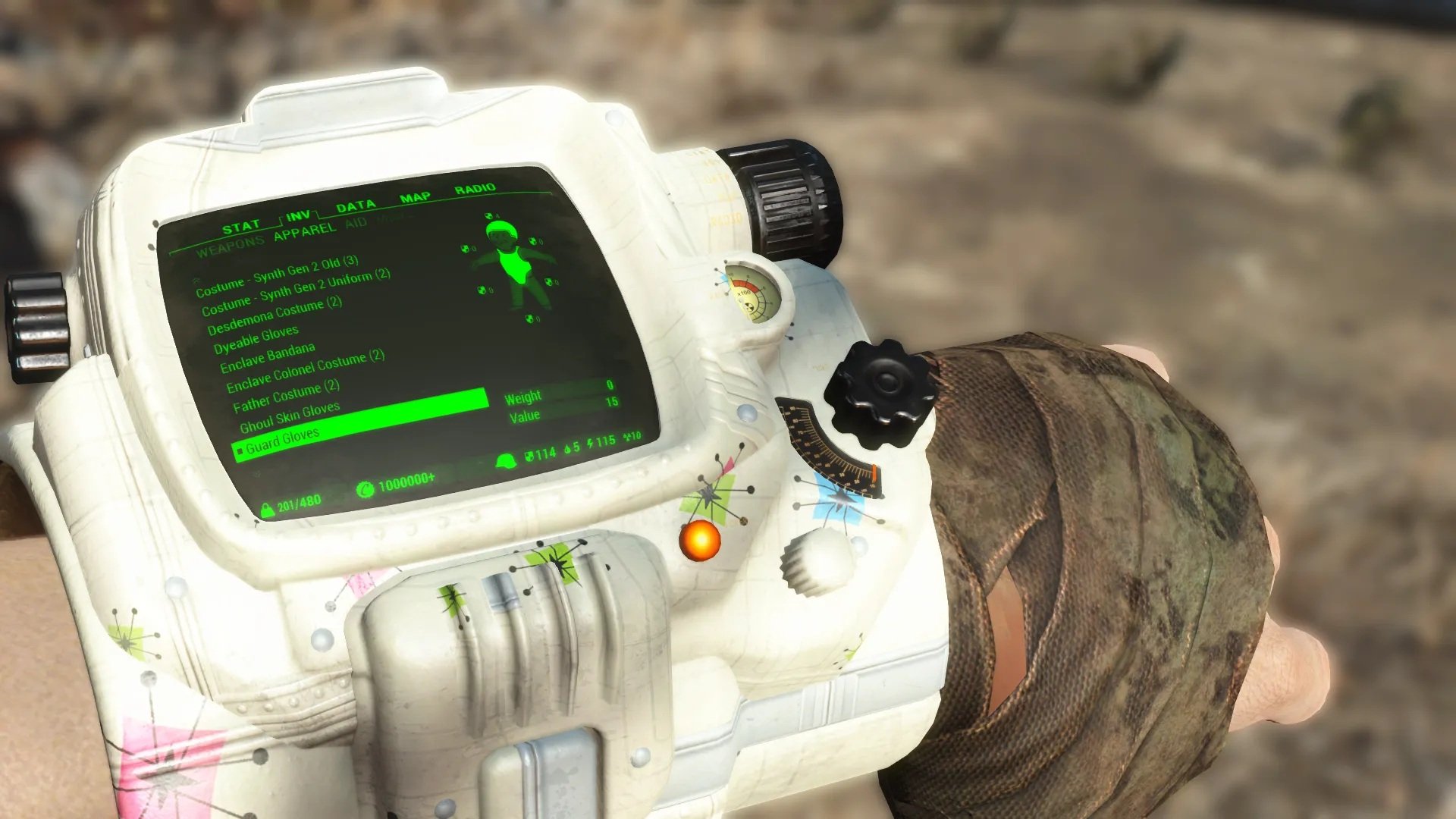 • Включенные в комплект варианты раскраски Пип-Боя могут быть применены как к Пип-Бою игрока, так и к Пип-Бою НПС. В основном они предназначены для использования с НПС, поскольку представляют собой модели с низкой детализацией, призванные минимизировать влияние высокодетализированных объектов. Однако игроки могут при желании применить любой имеющийся у них скин Пип-Боя к Пип-Бою НПС.