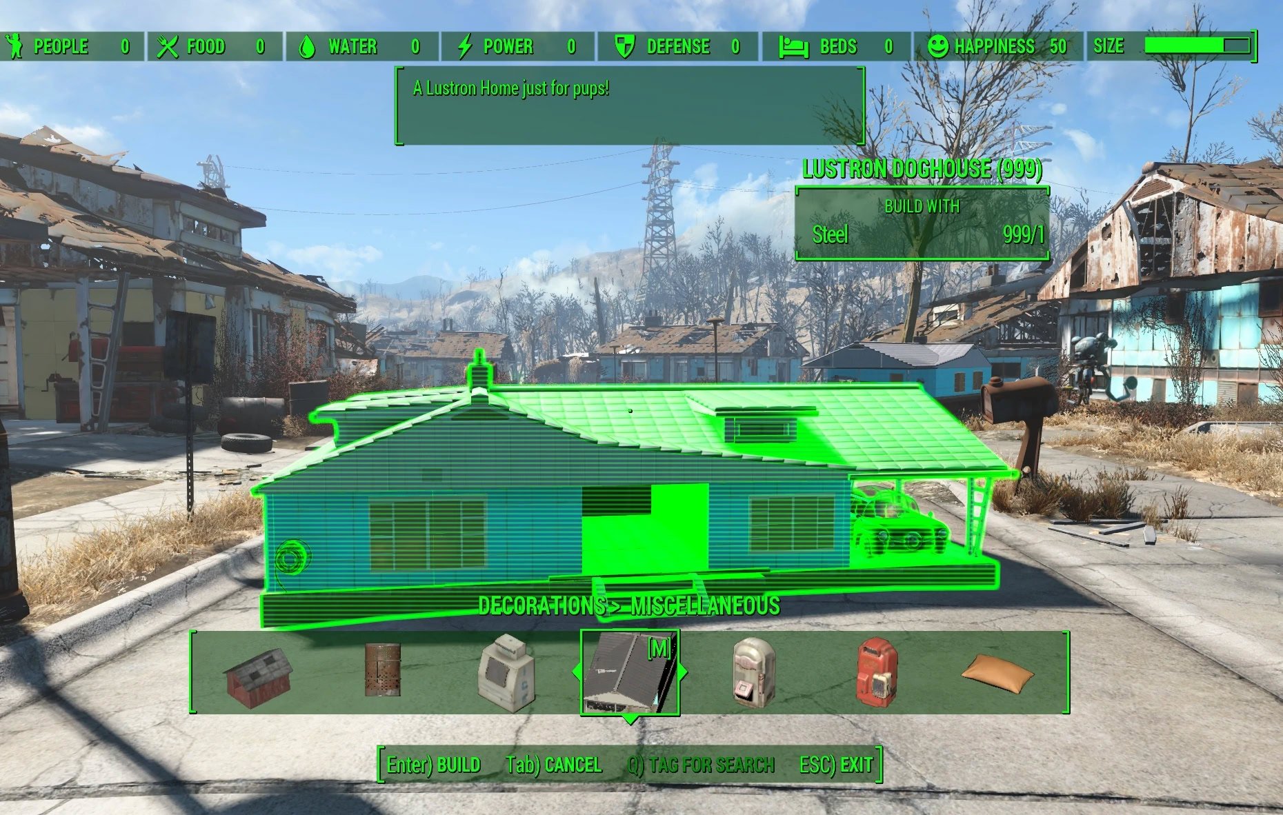 Вы когда-нибудь мечтали о маленьком домике для Псины? Нет? Что ж, теперь у вас есть шанс. Постройте эту мини-версию Дома Завтрашнего Дня в своем поселении, чтобы собакен мог отдыхать со вкусом.Находится рядом с обычной собачьей будкой в разделе мастерской.Установка и удаление стандартные.