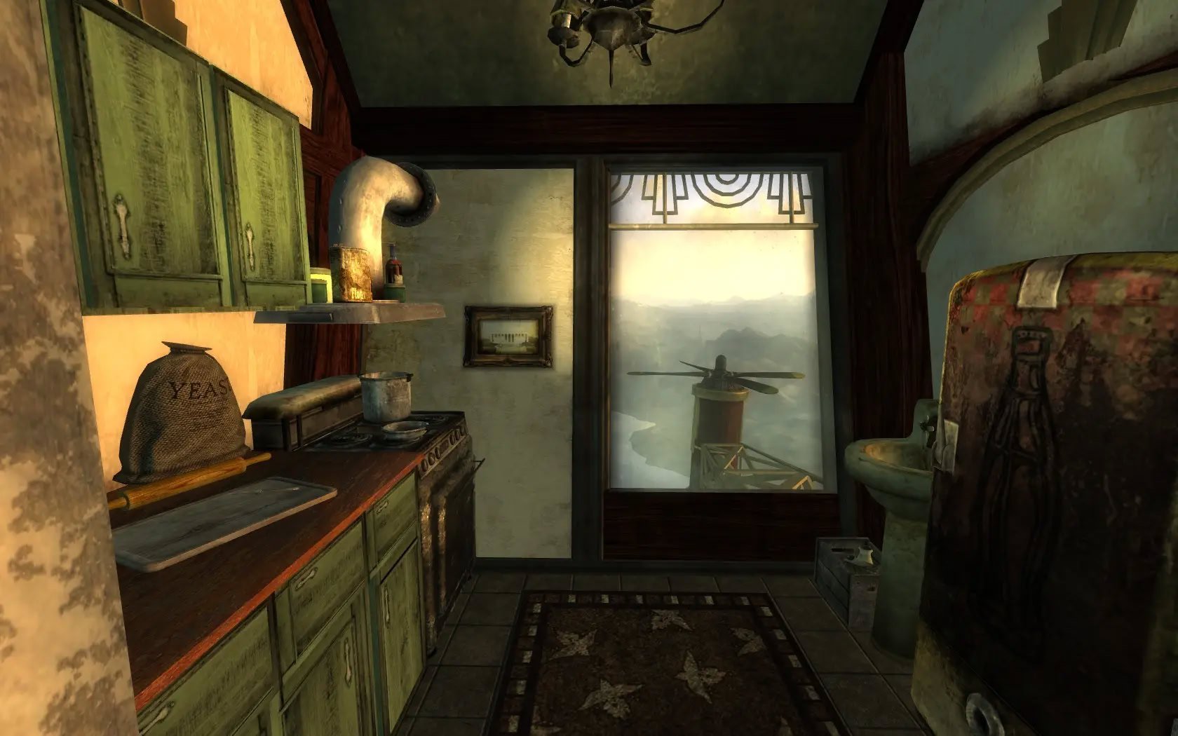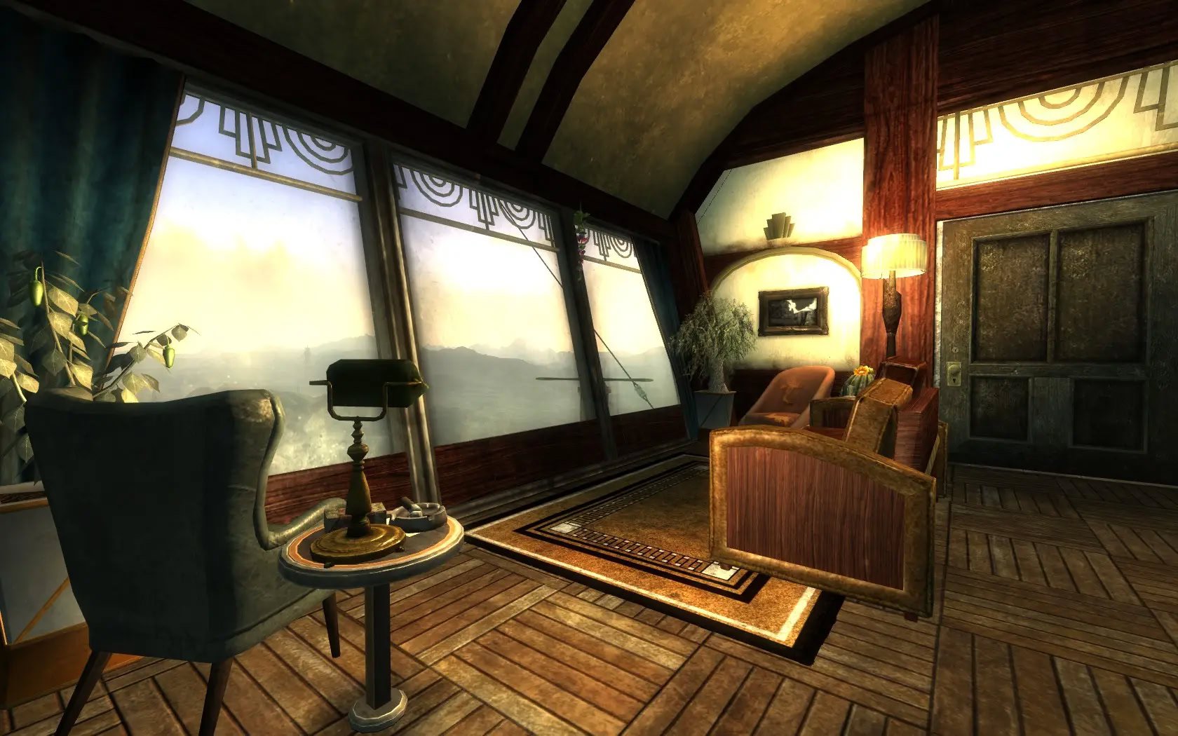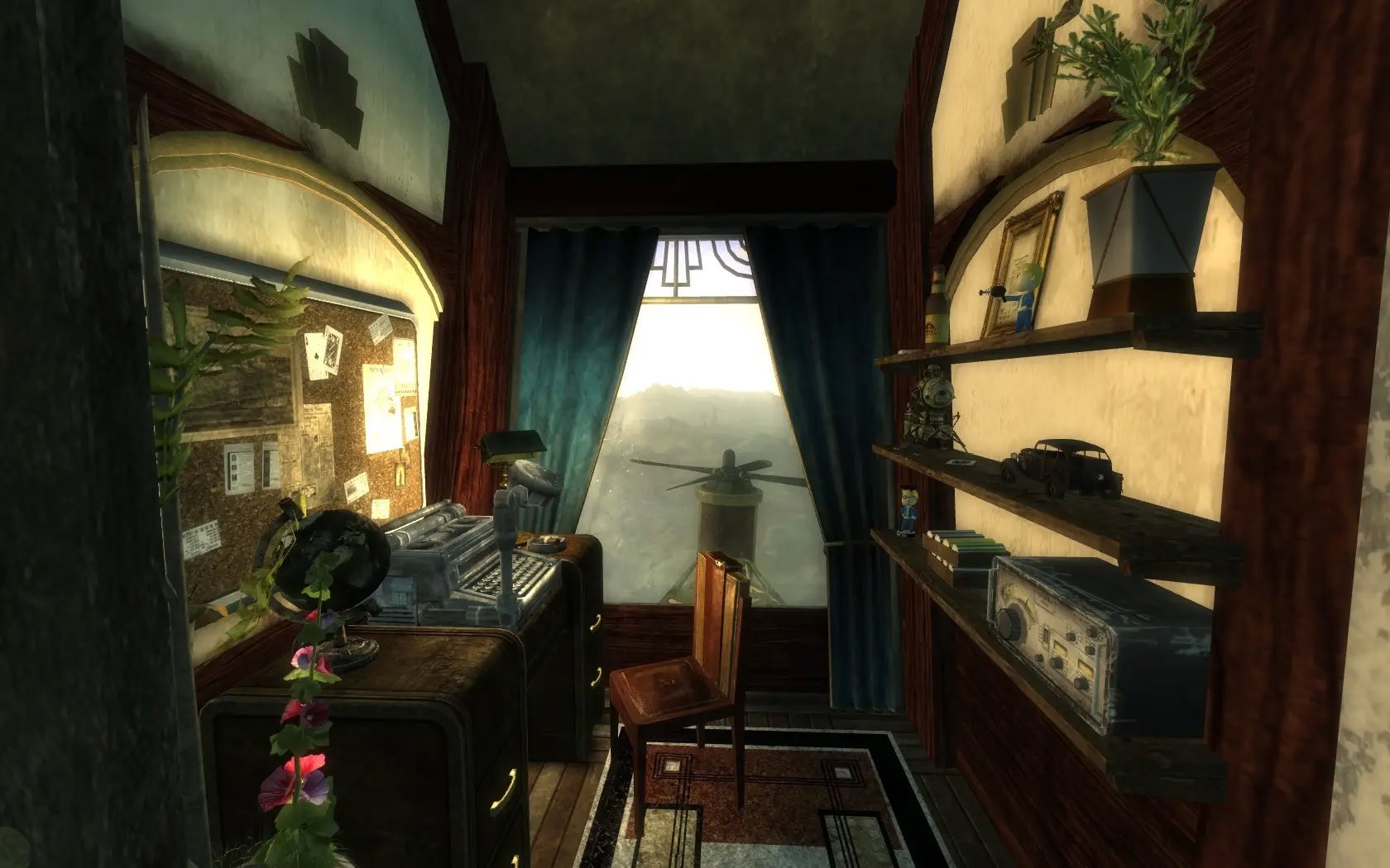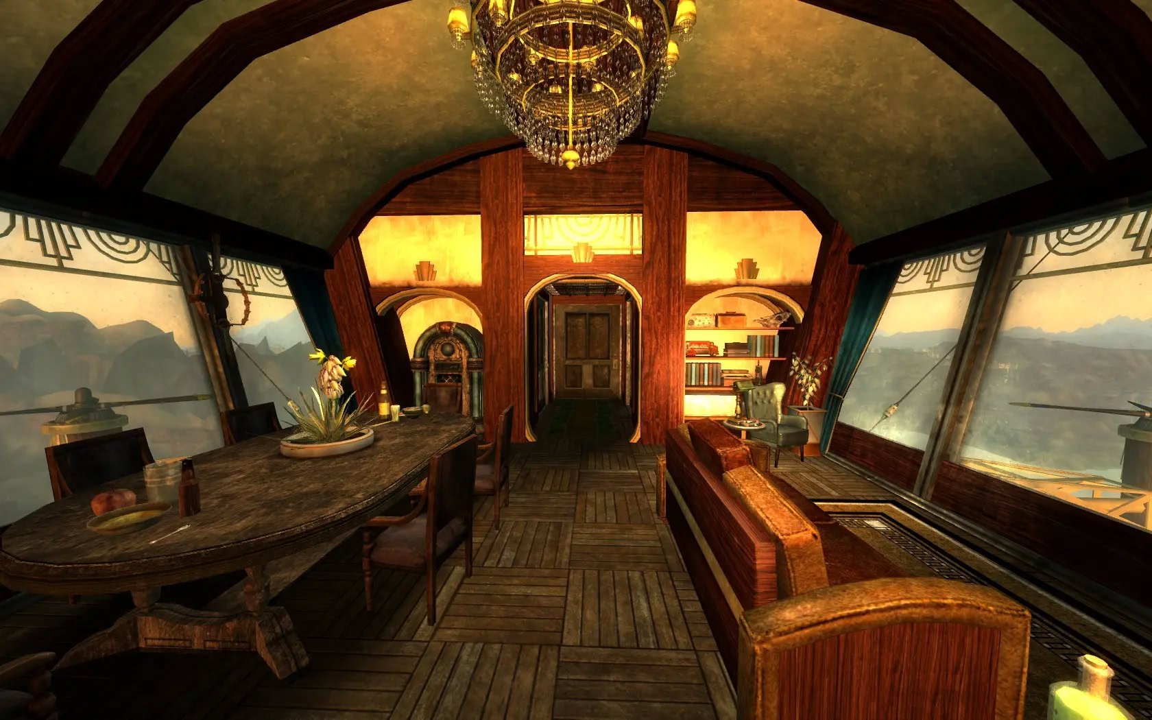 Добавляет дом для игрока на дирижабле с видом на озеро Мид и плотину Гувера в стиле ар-деко.Цеппелин "Розенбург" - это дом игрока в стиле ар-декоFallout. Помимо главной спальни есть две гостевые спальни поменьше. Комната робототехники является домашней базой для вашего компаньона, а скромный офис оснащен дисплеем в виде снежного шара.