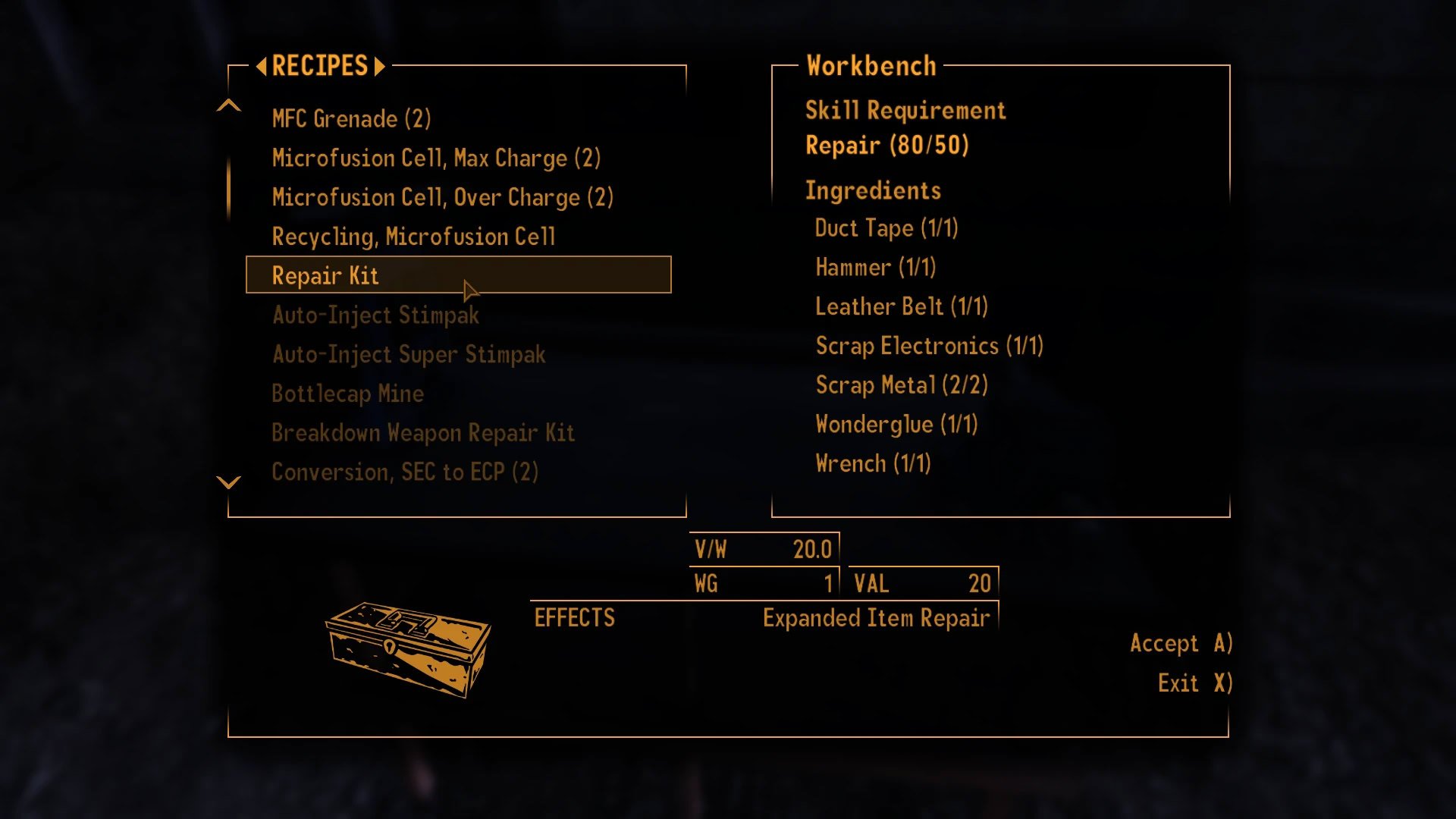 Это позволит вам ремонтировать предметы, используя более широкий спектр других подобных предметов.По умолчанию ремонтные комплекты предоставляют один расширенный ремонт. Если вы ремонтируете предмет, используя один из вариантов расширенного ремонта, один из ваших активных ремонтных комплектов будет израсходован. Если вы используете все свои активные ремонтные комплекты, меню ремонта закроется, но вы можете снова открыть его, чтобы продолжить ремонт, используя обычные предметы.