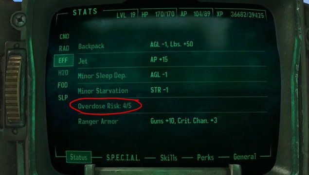 Легион, может, плох во многих отношениях, но в одном он совершенно точно прав: наркотики - плохо! Этот мод вводит в игру механику передоза от большинства химических препаратов (не считая безобидных вроде табачной жвачки и Целебного порошка - наконец-то он вам пригодится!). Теперь нельзя просто разом закинуться кучей субстанций и превратиться в неостановимую машину смерти, а также бесконечно поправлять здоровье стимуляторами: теперь в игре есть безопасное число доз, которое можно принять единовременно (зависит от ваших характеристик SPECIAL). Превысите это число - и получите риск внезапной смерти, который будет все повышаться, если вы не прислушаетесь к своему лихорадочно стучащему сердцу... Спустя некоторое время счетчик доз сбрасывается (организм выводит химию), так что вы сможете употреблять вещества вновь без опаски. Этот мод также повышает ценность докторов, к которым в ванильной игре мало кто обращается.