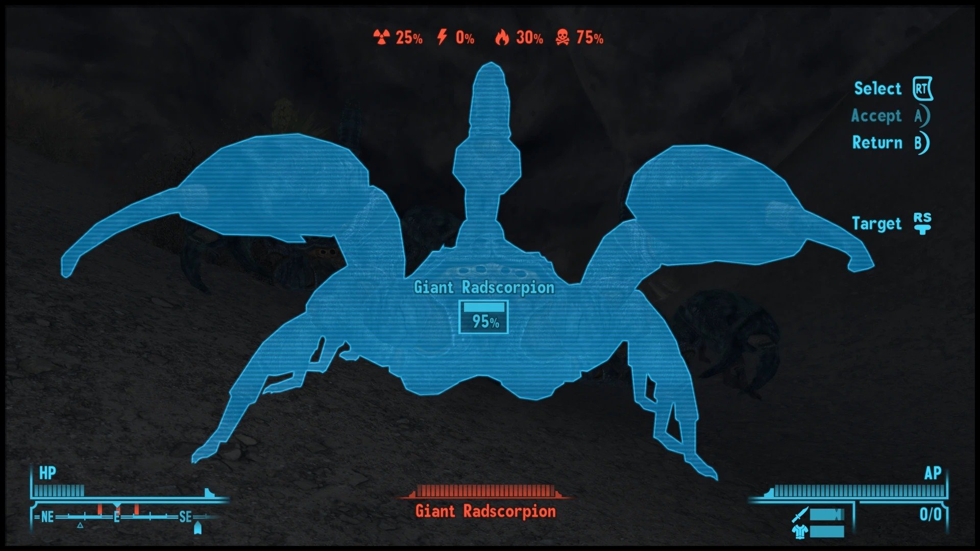 Новая панель интерфейса для VATS, отображающая сопротивляемость цели радиации, энергии, огню и яду. Каждая панель имеет соответствующий значок и процентное значение, которое обновляется при переключении между целями и становится красным во время боя.