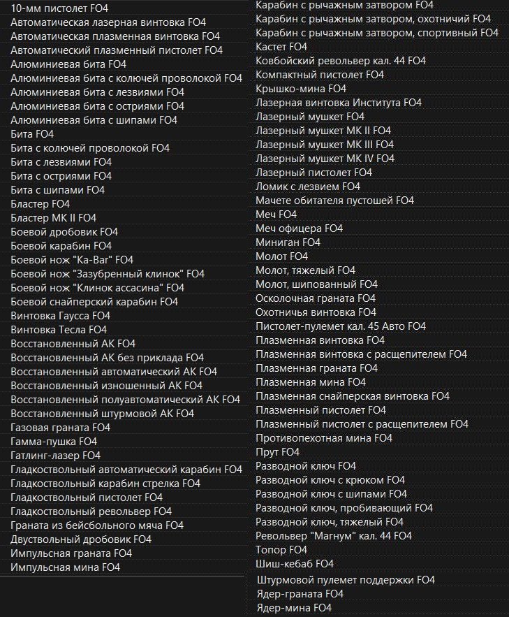 Также в архиве есть bat файл для мгновенного получения всего оружия и модификаций которые им нужны (продублированные, модификаций хватит на всё оружие) - скинуть его в корневую папку и в игре в консоли выбрать персонажа или ящик и ввести bat F4weap