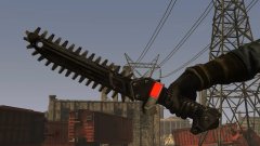 Цепной клинок, похожий на версии из ванильных FO3 и FNV, просто больше соответствующий представлению о том, как выглядят цепные клинки.Также более понятный источник питания, поэтому на задней панели есть порт для аккумуляторной батареи и крышка для смазки пилы.