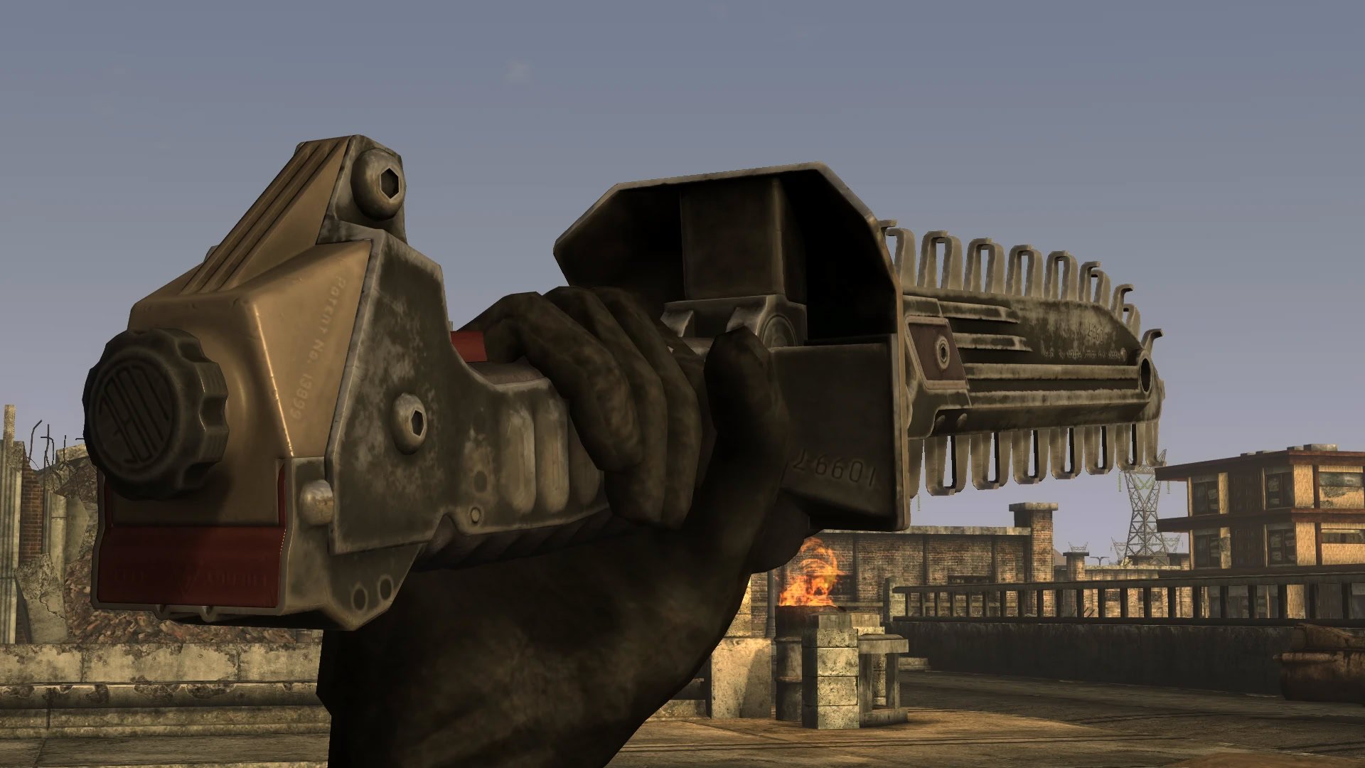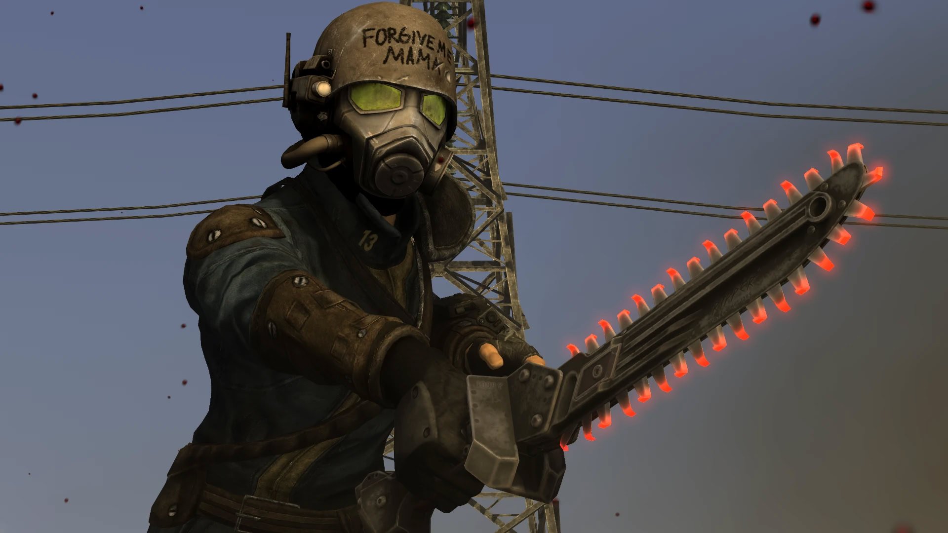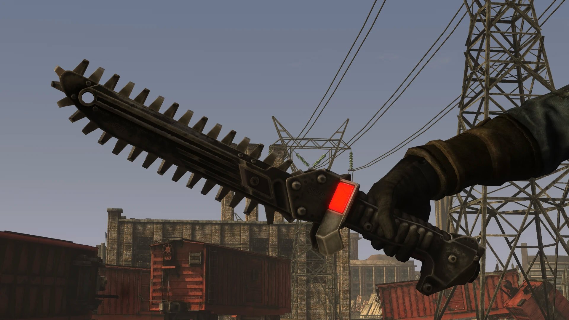 Есть пусковой выключатель и рычаг дроссельной заслонки; красный индикатор на левой стороне служит индикатором того, включена ли эта штука.В игре отображается как вибронож "Потрошитель"и моды оружия тоже переименованы соответствующим образом, поэтому для него требуется .esp.Требования: Gun Runners' Arsenal, JIP LN NVSE Plugin, JohnnyGuitar NVSE